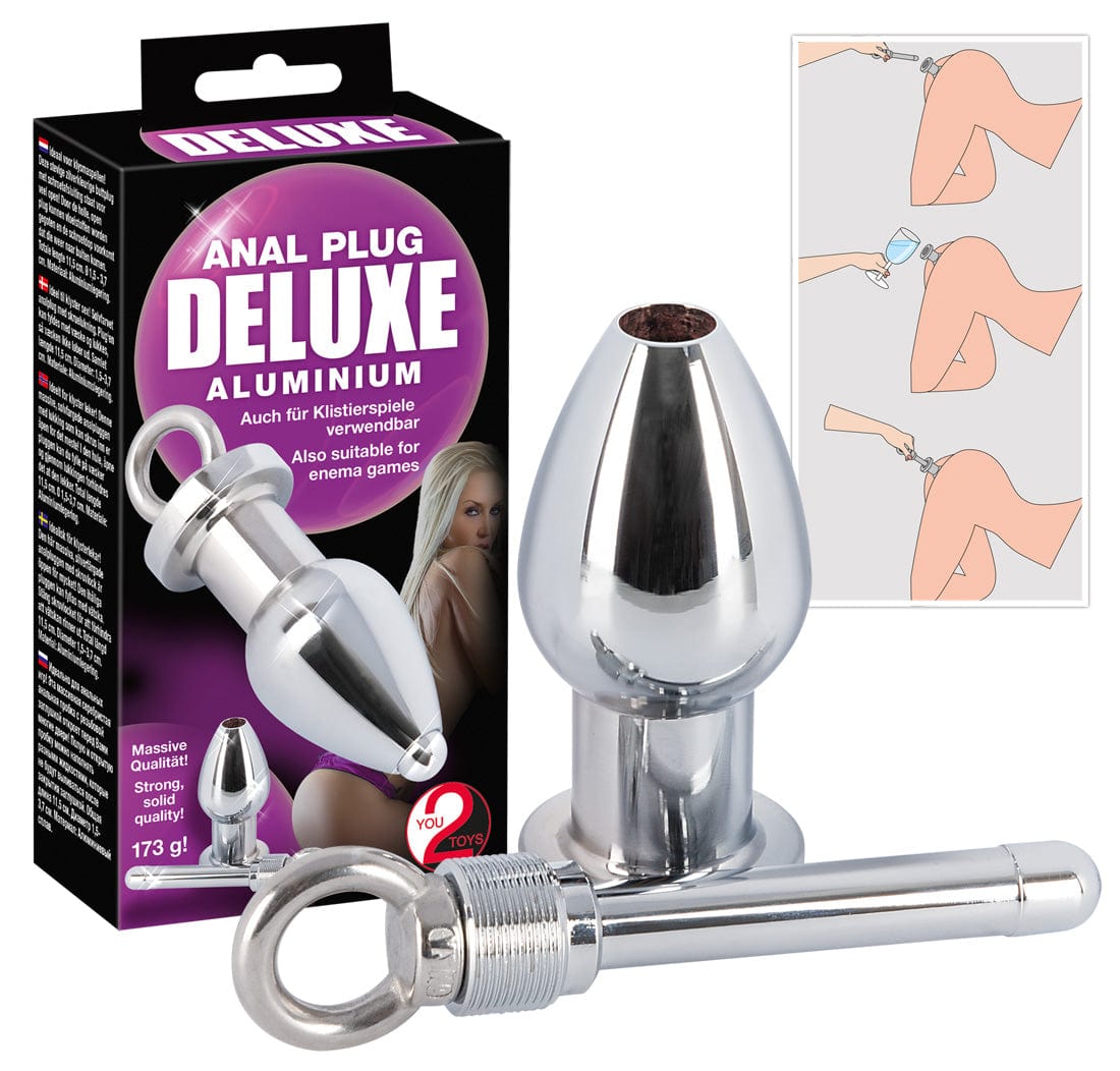 Hohler Analplug aus poliertem Aluminium mit Verschluss und Haltering.. – glatte Oberfläche. – leicht zu reinigen. – mit 1,5 cm dicker Spitze. – verträgt sich mit allen Gleitmitteln. – der Verschluss kann entfernt werden, sodass der Plug hohl ist