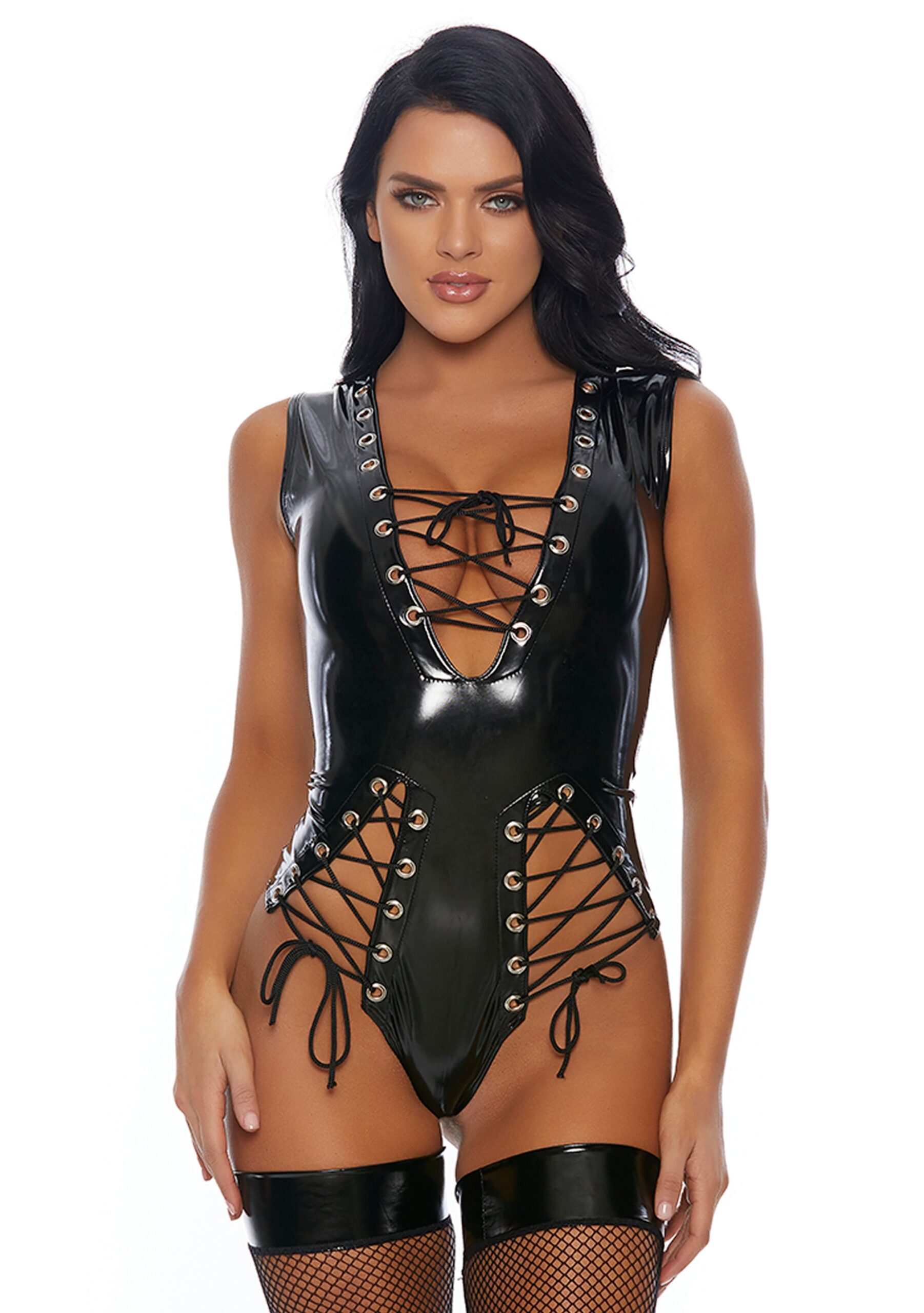 Reizender Body mit Schnürung an Brust und Taille.. Eigenschaften:. – Material aus 80 % Polyester und 20 % Elasthan. – glänzend. – mit tiefem Ausschnitt. – ärmellos. – dehnbar. – Handwäsche empfohlen. – Einheitsgröße S-L