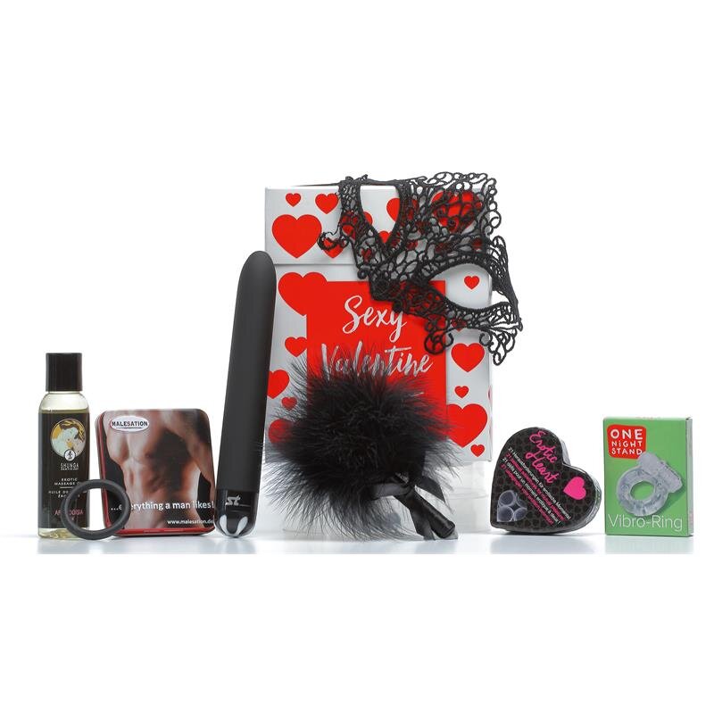 Kleine Geschenkbox mit verschiedenen 8 Artikeln speziell für den Valentinstag. Inhalt: STEAMY SHADES Feather Tickler STEAMY SHADES Lace Embroidery Eyemask Aqua Silk Vibrator MALESATION Cockring Silicone 3,2cm black SHUNGA Massage Öl Aphrodisia 60ml TEASE & PLEASE – Erotic Heart mini ONE NIGHT STAND Vibro-Ring MALESATION Peppermints 45g Leichte Artikeländerungen vorbehalten.