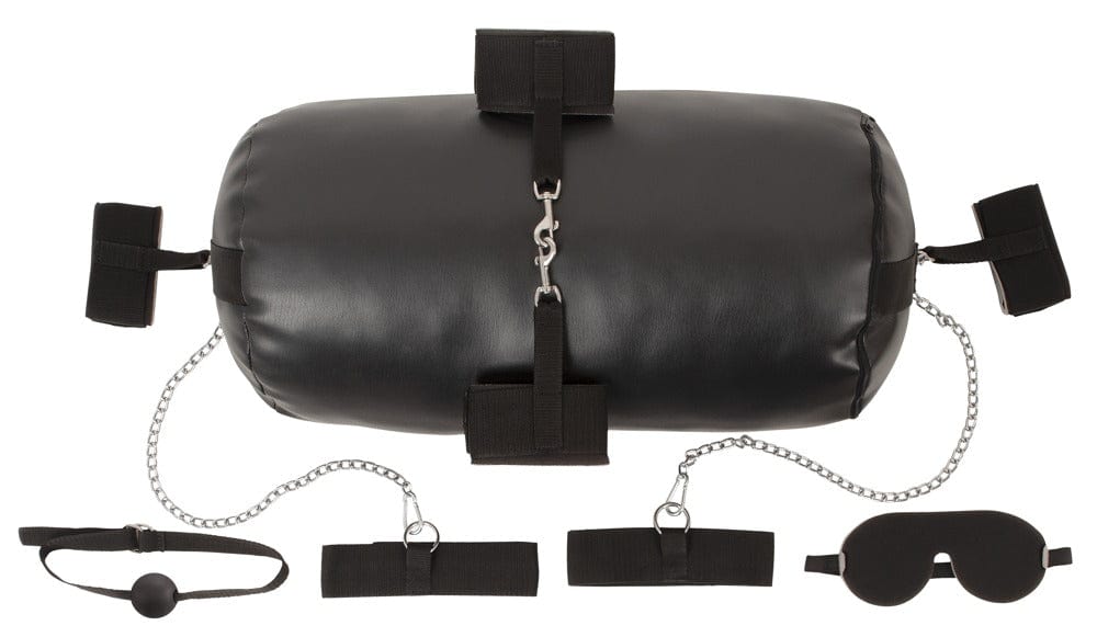 Fesselnde Stellungsspiele mit Komfort!. In dem Komplett-Set Bondage Barrel von Bad Kitty ist gleich alles dabei für lustvolle Fessel- und Stellungsspiele:. 1 x große weich gepolsterte Bondage-Kissenrolle (55 cm lang, Ø 25,5 cm). 4 x softe Fessel-Manschetten für Hände und Füße mit Karabinern (je 5 cm x 34 cm). 2 x Oberschenkel-Fesselriemen (je 5 cm x 53,5 cm). 2 x Karabinerketten (je 59 cm lang). 1 x Knebel (60 cm lang, Ball-Ø 4 cm). 1 x Augenmaske (8,5 cm x 19 cm).. Die große weich gepolsterte Bondage-Kissenrolle sorgt bei Fessel- und Stellungsspielen für höchsten Komfort. Sie bietet als Nacken-, Knie- oder Sitzrolle bequemen Halt. Unter das Becken geschoben vereinfacht sie Sexpositionen und verhilft zu tiefer gehenden Penetrationen. Zur einfachen Reinigung ist der Kunstlederbezug abwaschbar.. An die beiden D-Ringe der Kissenenden können beiliegende Hand- und Fußfesseln mit ihren Karabinern schnell eingehakt werden. Genauso wie die beiden Oberschenkelfesseln mit den beiden Karabinerketten. Die Fesseln und Riemen sind mit Klettverschlüssen schnell an- und abgelegt, sowie passend verstellbar. Beiliegende weich gepolsterte Augenmaske und der inkludierte Knebel sorgen zusätzlich für fesselnde Spielmöglichkeiten. Beides ist ebenfalls passend verstellbar.. PVC, Polyester, Polypropylen, Metall.