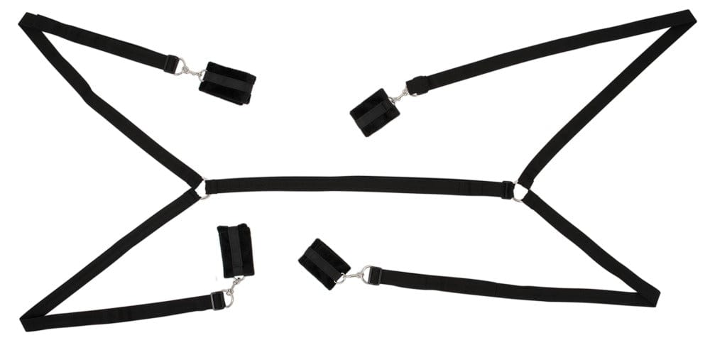 So wird jedes Bett ruckzuck zur Fessel-Spielwiese!. Mit dem 5-teiligen Fessel-Set Bed Shackles von Bad Kitty lässt sich jedes Bett in einen profimäßigen Bondage-Playground verwandeln. Egal, ob zuhause oder unterwegs. Das verstellbare Gurtkreuz wird einfach unter die Matratze gelegt. An den Gurten mit den Karabinern werden dann die Fesseln für Hände und Füße einfach eingehakt. Die weichen bequemen Hand- und Fußfesselmanschetten sind mit praktischen Klettverschlüssen ausgestattet und somit passend verstellbar.. Gurtkreuz mit 5 reißfesten, verstellbaren Riemen; jeweils 145 cm lang.. Fesselmanschetten jeweils 8 cm breit, 2 x 21 cm lang, 2 x 27 cm lang, verstellbar.. Polyamid 80%, Polyurethan 15%, 5% Metall verchromt.