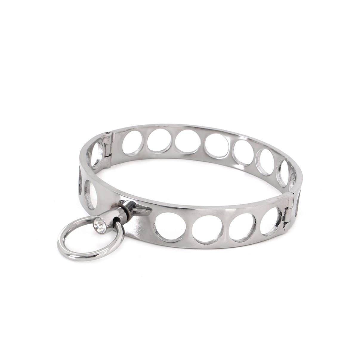 Dieses stylische Halsband sorgt für außergewöhnliche Spiele.. Eigenschaften:. – Halsdurchmesser Größe M = 11,5 cm. – Halsdurchmesser Größe L = 13,5 cm. – in einem offenem Design. – mit Ringöse zur Befestigung einer Leine o.ä.. – hochwertig verarbeitet. – für besondere Bestrafungen. – mit Inbussschlüssel zum Öffnen und Schließen