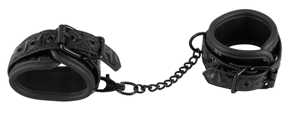 Sexy Handfessel in Diamantschliff-Optik mit Verbindungskette.. Eigenschaften:. – Material Polyurethan, Metall, synthetischer Kautschuk. – leicht gepolstert. – mit Karabiner. – sexy Design. – Verbindungskett 15 cm lang. – Fesseln 5,5 cm breit. – Länge verstellbar von 22-30 cm