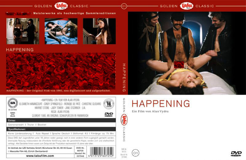 Happening ist die aufregende Geschichte der jungen Pariserin Brigitte. Ihr ständiges Schweben zwischen knallhartem Powersex und lasziver Erotik. Ihr Mann hat ihr nicht viel zu bieten, erstens ist er 30 Jahre älter, zweitens kommt es ihm nur, wenn er seine Frau in Oma’s Nachtwäsche stecken kann. Das ist nicht nach dem Geschmack der sexhungrigen Brigitte. Heimlich holt sie alles nach, was ihr die Ehe nicht bieten kann. In einer Autowerkstat lässt sie sich von vier Mechanikern gleichzeitig bedienen. Dre rocker überfallen sie in einem düsternen Kellergewölbe und im berühmten Pariser Sex-Club “La Terasse” nimmt sie an einer Massenorgie teil. Happening, ein Film über das Doppelleben einer Lust-hungrigen, schönen jungen Frau.