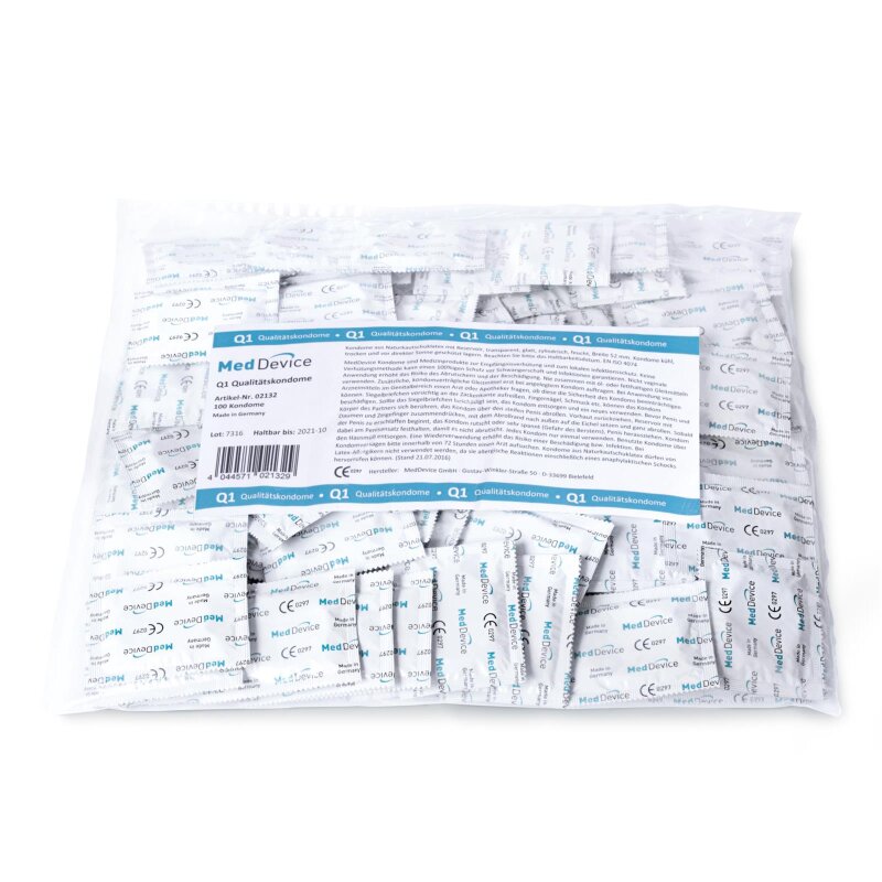 Kondome Med Device Q1 100 Stück – Der Spaßmacher aus Naturkautschuklatex mit dem Extra an Sicherheit! Bereit, den Spaß auf die nächste Stufe zu heben? Dann greifen Sie zu den Med Device Kondomen Q1 im praktischen Vorratspack mit 100 Stück! Speziell designed für maximale Freude und Schutz, bieten diese transparenten Kondome, hergestellt aus hochwertigem Naturkautschuklatex, das ultimative Gefühl und Sicherheit beim Liebesspiel. Nominale Breite: 53 mm – perfekt passend für Komfort und Schutz. Länge: 175 mm – ausreichend lang für jede Situation. Wandstärke: Nur 0,07 mm – Extra dünn für ein natürlicheres Gefühl. Gleitmittel: Dimeticon – Sorgt für geschmeidige Action ohne unnötiges Rutschen! Made in Germany: Qualität und Zuverlässigkeit, auf die man sich verlassen kann. Unsere Med Device Kondome Q1 sind nicht nur zuverlässige Begleiter, sondern auch absolute Stimmungskanonen im Schlafzimmer. Mit dem Reservoir haben Sie die Sicherheit immer an der richtigen Stelle und dank der hochwertigen Gleitbeschichtung aus Dimeticon wird jeder Ritt zur geschmeidigen Fahrt. Also, warum warten? Holen Sie sich Ihren Vorrat von 100 Stück und erleben Sie Sicherheit und Vergnügen „Made in Germany“ auf hohem Niveau. Machen Sie sich bereit für aufregende Momente voller Spaß und Sicherheit – denn mit Med Device Kondomen Q1 sind Sie immer auf der sicheren Seite!