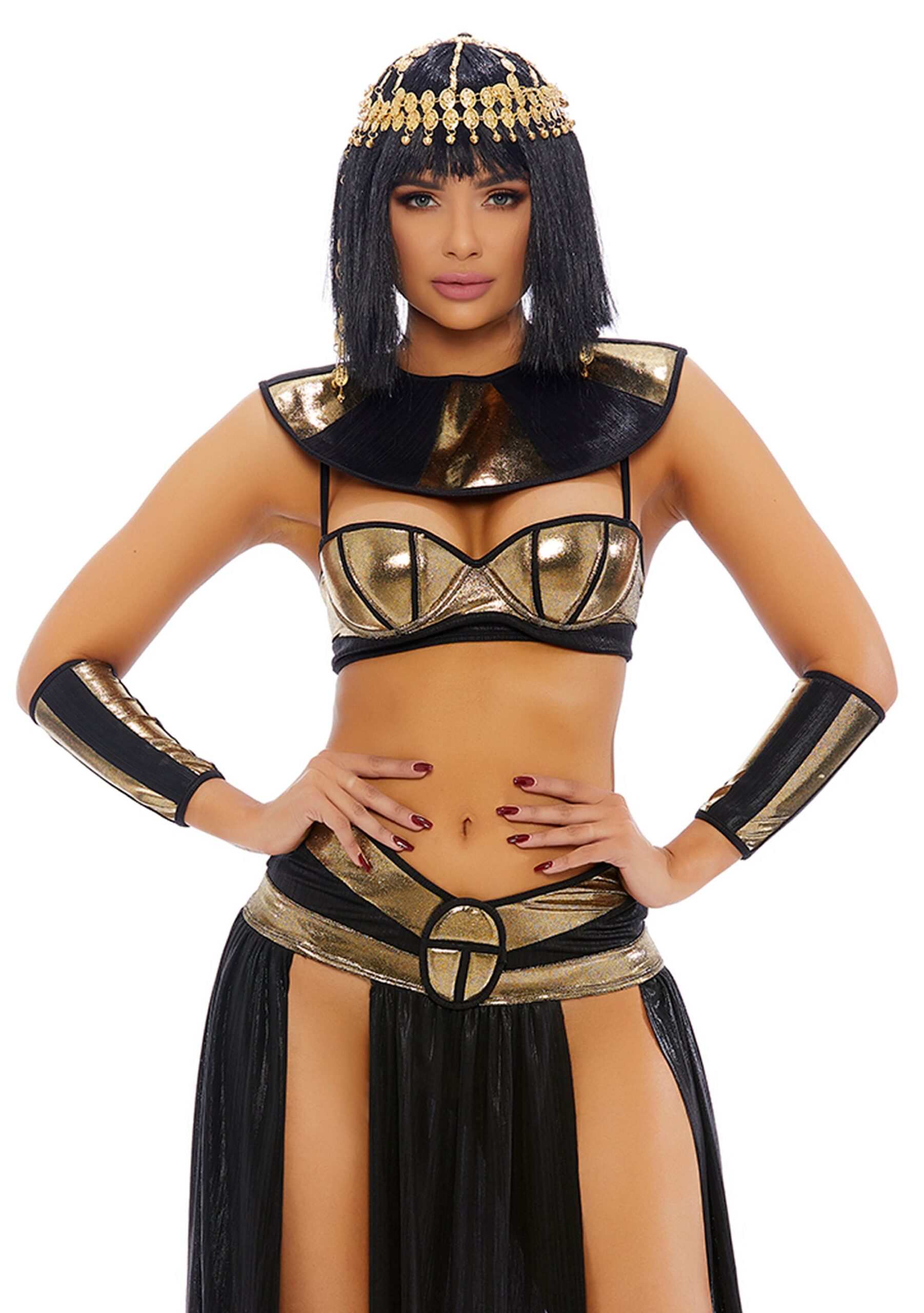 Verführerisches Kleopatra Kostüm mit passendem Rock und Zubehör.. Eigenschaften:. – Material aus 84 % Polyester und 16 % Elasthan. – inklusive Slip. – mit Hals- und Armzubehör. – mit Bügel-BH. – Handwäsche empfohlen. – Einheitsgröße S-L