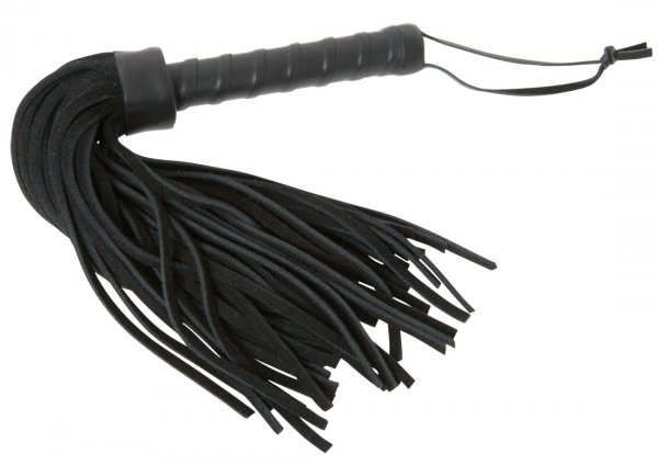 Kurzer schwerer Flogger mit schmalem, gewickeltem Griff, vielen Striemen und Halteriemen. Schwarz. Glattleder, Rauhleder (Velours). Gesamtlänge (ohne Halteriemen) 37 cm.