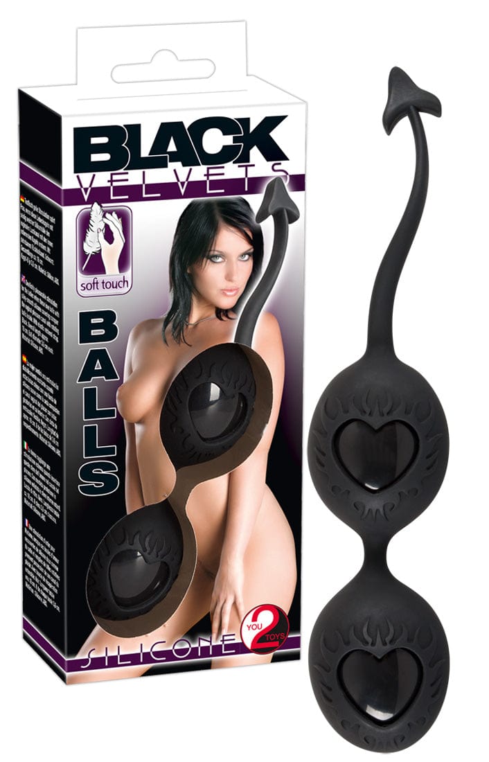 Vier Liebeskugeln in schwarz mit glänzenden Herzen verziert und Teufelsschwanz.. Eigenschaften:. – softe Oberfläche. – Kugeldurchmesser 3,5 cm, Gesamtlänge 18 cm. – mit Rückholband und innenliegenden Rotationskugeln. – aus Silikon (phthalatfrei)