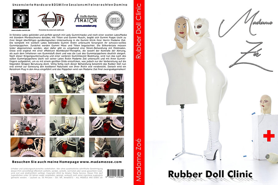 In feinstes Latex gekleidet und perfekt gestylt mit Lady Gummimaske und noch einer zweiten LatexMaske mit blondem Pferdeschwanz darüber, mit Titten und Gummi Muschi, begibt sich Gummi Puppe Uschi zu ihrer längst überfälligen gynäkologischen Untersuchung in die Gummi Klinik ihrer Herrin Madame Zoé. Die komplett mit weißem Latex bekleidete Gummi Ärztin untersucht fürsorglich ihr schwarz-weißes Gummipüppchen. Zunächst werden Gummi Möse und Titten begutachtet. Die Silikonbrüste müssen leider abgenommen werden, aber dafür gibt es umgehend eine Strom-Behandlung mit Elektroden. Diese wird ergänzt mit einer effektiven Atembeutel-Theraphie, die sowohl der Kontrolle der Atmung, als auch dem Inhalieren von Gummiduft dient, welches die Lust des Gummipüppchens deutlich steigert. Nach dieser Eingangsuntersuchung und einer weiteren Gummibeutel Beatmung, wird nun das Loch des süßen Gummipüppchens Uschi von seiner Latex Ärztin Madame Zoé untersucht und mit ihren Gummifingern aufgedehnt, um es mit einem gerillten Dildo einzuficken, was jedoch nur der Vorbereitung auf die folgenden Strapon Benutzung dient. Völlig fertig nach dieser Behandlung bekommt das Rubber Doll nun erst einmal zur Genesung den kostbaren Natursekt von Ihrer Ärztin oral verabreicht. Danach wird ein Reizstrom Plug in den Anus eingeführt und das Püppchen wird von Madame Zoé final zwangsabgemolken!
