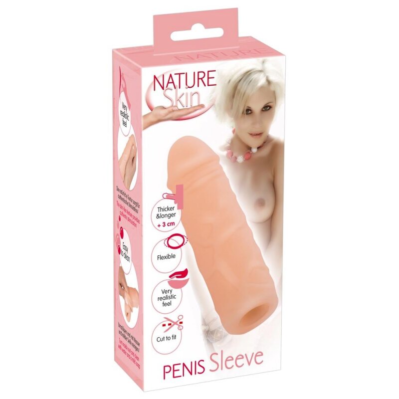 Verlängert und stützt! Hautfarbene Penishülle aus dem hautähnlichen Nature Skin-Material. 15,5 cm Gesamtlänge (davon 3 cm Verlängerung) Innen-Ø 2 cm (sehr dehnbar) Außen-Ø 4 cm Material: TPR, phthalatfrei gemäß EU-Verordnung 1907/2006/EC.