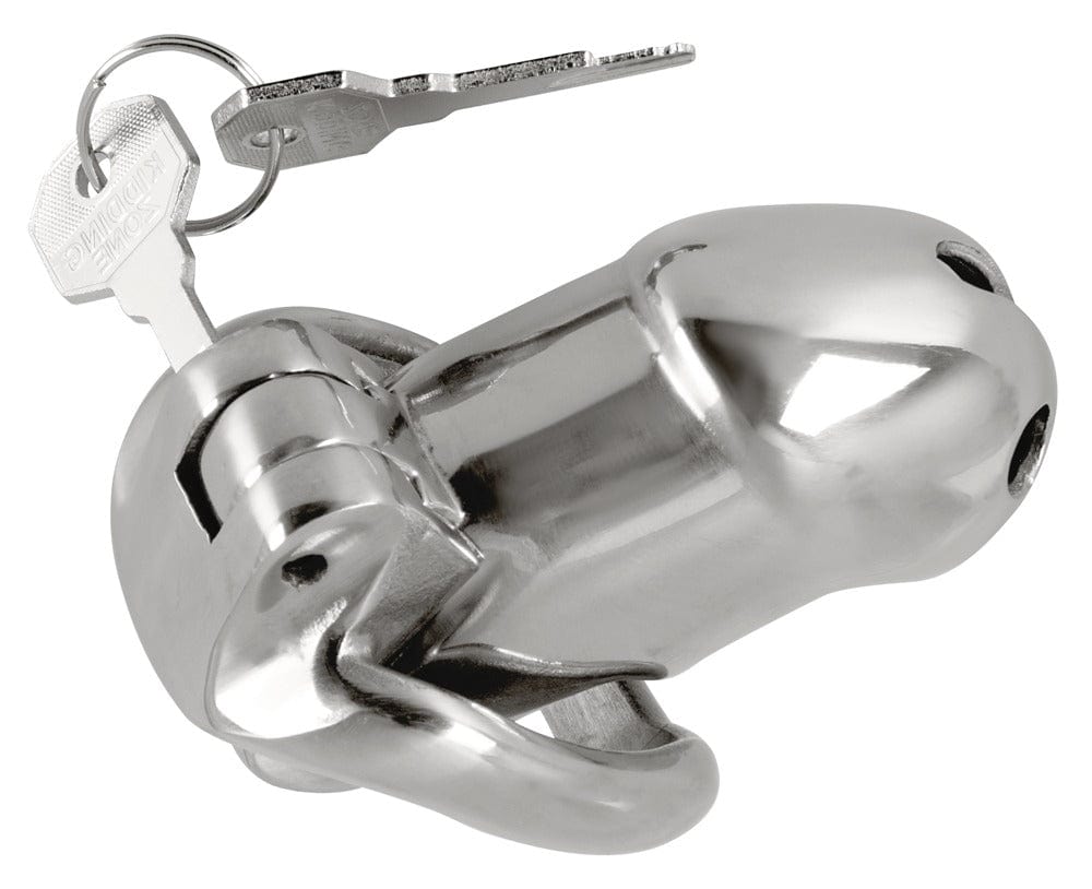 Abschließbares Lustobjekt!. Dieser Keuschheitskäfig für den Penis Chastity Cage Short von Fetish Collection sieht nicht nur toll aus, er sorgt auch für unnachahmliche Tragegefühle der erzwungenen Enthaltsamkeit! Der Peniskäfig ist aus hochwertigem Edelstahl gefertigt und von Hand poliert.. Der Peniskäfig lässt sich leicht an- und ablegen: Der nicht erigierte Penis kommt in den Käfig, der stählerne Ring wird um die Hoden gelegt. Selbstverständlich ist der Käfig mit dem integrierten Schloss (inkl. 2 Schlüsseln) abschließbar.. Die Eichel des geschlossenen Peniskäfigs ist mit Öffnungen versehen, sodass der Penis gut durchlüftet und der Träger noch problemlos urinieren und duschen bzw. baden kann – perfekt für 24/7-Erziehungsspiele.. Käfiglänge oben 8,5 cm, Käfiglänge unten 4,2 cm, Ø 2,8 x 3,5 cm.. Hodenring-Ø 4,4 x 5,3 cm.. Gewicht 289 g.. Metall.