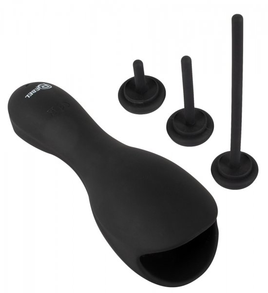 Zum direkten Verwöhnen der Penisspitze und Harnröhre! Sehr handlicher kompakter Glans Masturbator with 3 attachable Dilators von Rebel, der mit prickelnden Vibrationen und unzähligen weichen Noppen direkt die Eichel und das Frenulum verwöhnt.