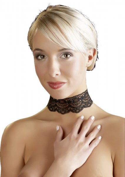 Schwarzes Spitzen-Halsband mit Ketten/Karabinerverschluss – mehrfach verstellbar. Länge ca. 30–45 cm, 5 cm hoch. 100% Polyester.