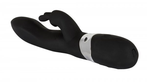 Schwarzer Vibrator mit 2 kraftvollen Motoren, Klitoris-Reizarm in Hasenform und 7 Vibrationsmodi per Knopfdruck. Wiederaufladbar anhand des beiliegenden USB-Kabels! Gesamtlänge ca. 21 cm, Ø 3–3,6 cm. Material: Silikon, ABS, phthalatfrei gemäß EU-Verordnung 1907/2006/EC.