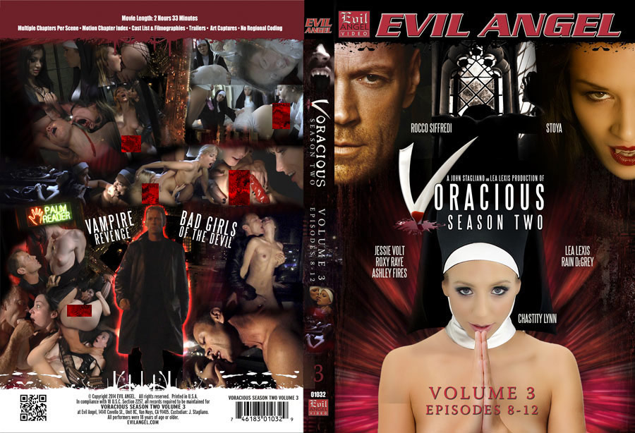 Vorsicht bissig! Pass auf deinen Hals auf, wenn du dir Episode 8-12 von Voracious Staffel 2, Folge 3 anschaust.Dieser Film beinhaltet aufregende Atemkontrolle, verbale Erniedrigung und raue Spielchen zwischen Dominanz und Unterwerfung. Genieße die Sexualität, die sich auch durch deine Blutbahnen zieht.Dieser Film ist ein unkonventionelles sexuelles Meisterwerk welches in der dunklen Welt der Vampire spielt. Dunkle Fetisch-streifzüge, die ihresgleichen suchen.Die Straßen von San Francisco sind die Kulisse für dieses Spektakel und liefern eine feurige Atmosphäre für Gaping, Rachen und Seelen-Unterwerfung!”Voracious Season Two Volume 3″ hält die technischen, erotischen und künstlerischen Standards aufrecht, die bereits durch die erste Staffel geschaffen wurden! Ein Porno nicht nur für Fans von Gothicporn und Anhängern von Stagliano’s sexuell-intensivem Film.